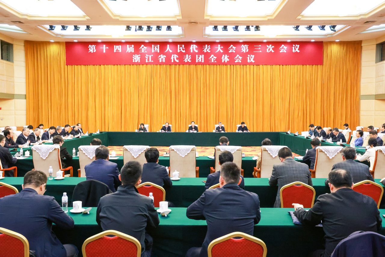 3日,出席十四届全国人大三次会议的浙江代表团在驻地举行全体会议。代表们一致推选王浩为浙江代表团团长,刘捷、傅明先、陈金彪、吴晶为副团长。