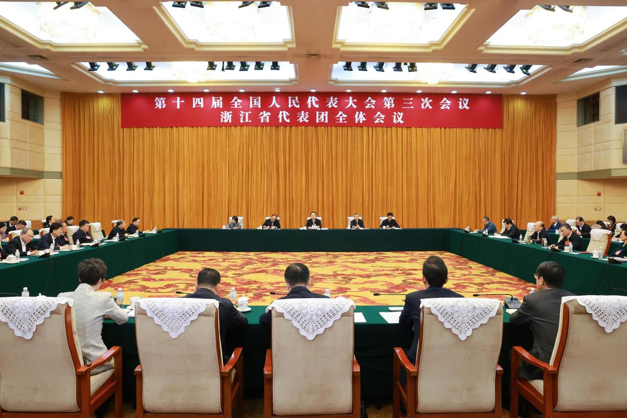 3月7日上午,浙江代表团举行全体会议,传达学习习近平总书记在看望参加全国政协会议的民盟民进教育界委员时的重要讲话精神。省委书记、省人大常委会主任王浩主持会议并讲话。潮新闻记者 李震宇 摄