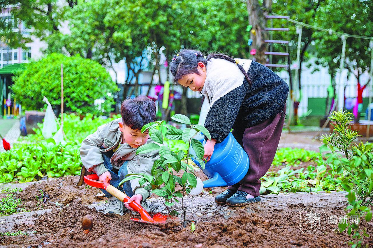 3月12日,在湖州市吴兴区埭溪镇中心幼儿园,孩子们在种树苗。通讯员 何伟卫 摄