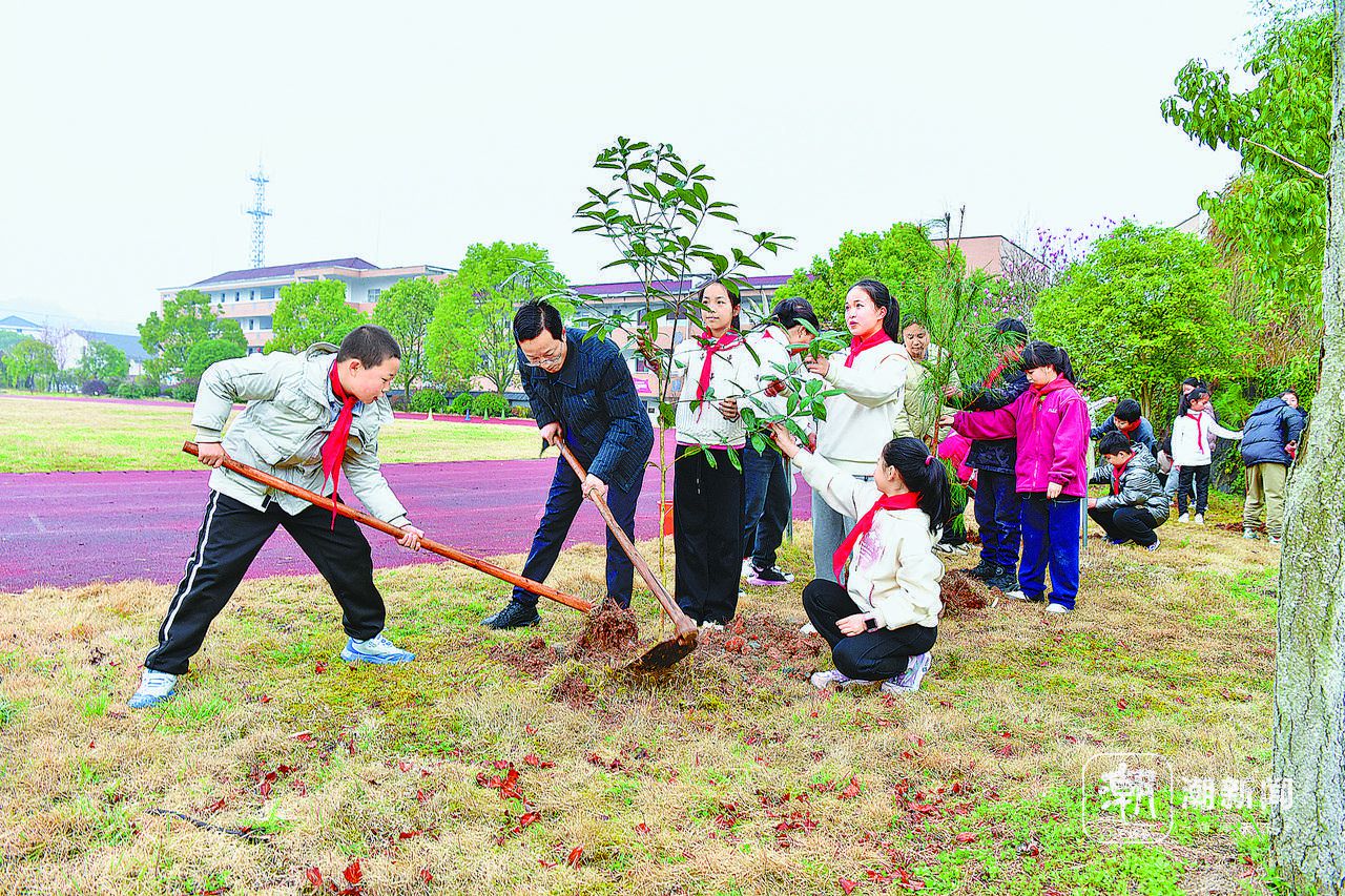 3月12日,植树节当天,金华市宾虹小学师生一起在学校四季果园,将无花果、桃树等10余株果树幼苗精心栽种在规划区域,为校园增绿添彩。“果树种植不仅是劳动课,更是生动的生态教育。通过亲手种下一棵树,孩子们能更直观地感受生命成长的过程。”宾虹小学总校长余艳双介绍,四季果园作为校园劳动实践基地,已累计种植杨梅、猕猴桃、李子等15个果树品种共70余棵果树。