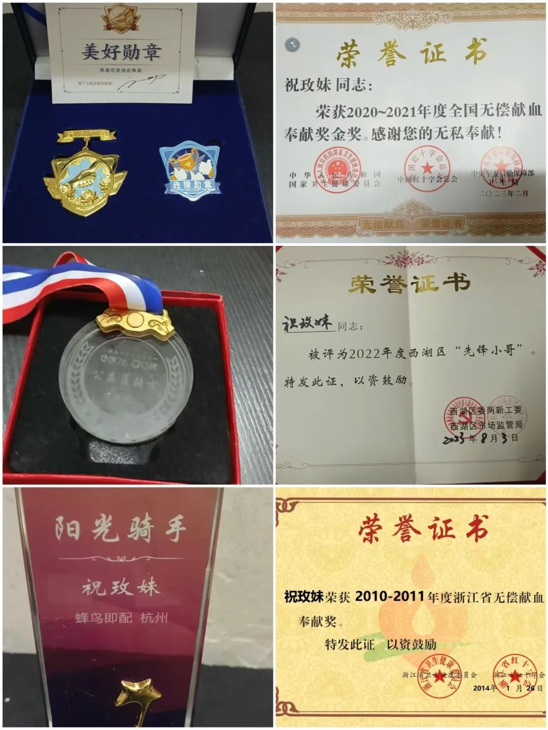 全国无偿献血奉献奖金奖、浙江省无偿献血奉献奖、无偿献血之江杯奖……如今,祝玫妹家中获得的荣誉证书琳琅满目,每张证书背后都是一次生命的接力。