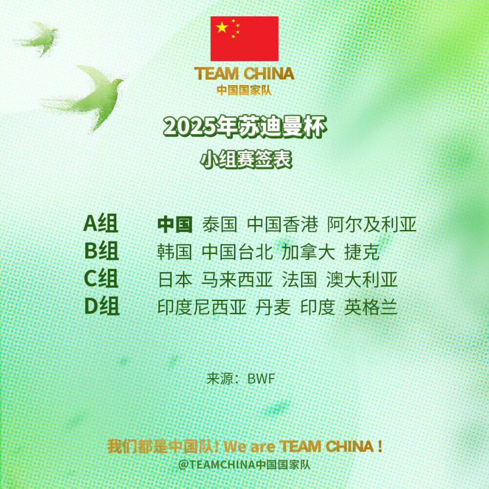 2025年羽毛球苏迪曼杯抽签仪式13日在中国厦门举行,中国队被分在A组,同组的还有泰国队、中国香港队和阿尔及利亚队。