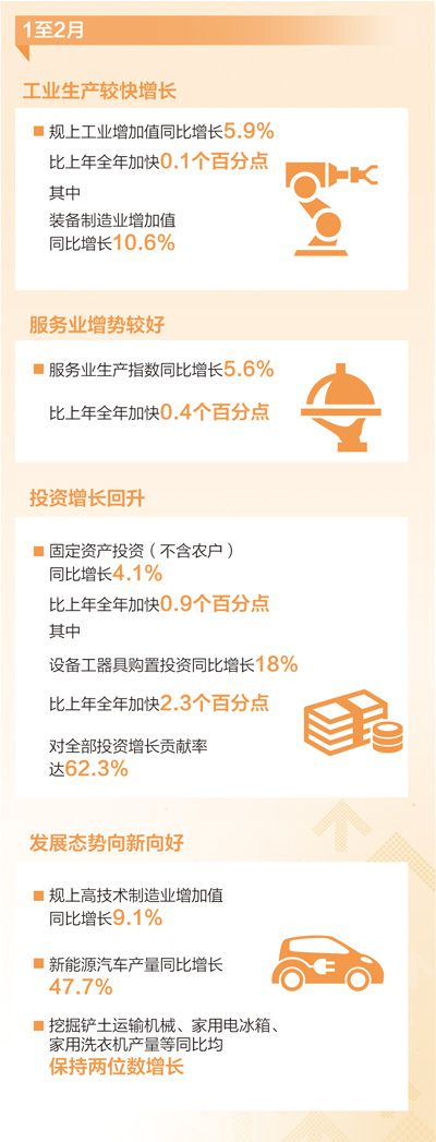 新型工业化稳步推进,工业生产较快增长。1至2月,规模以上工业增加值同比增长5.9%,比上年全年加快0.1个百分点。其中,装备制造业增加值同比增长10.6%,对工业增长支撑作用明显。春节期间,假日经济活跃,带动信息技术、旅游交通出行相关行业增长,服务业增势较好。1至2月,服务业生产指数同比增长5.6%,比上年全年加快0.4个百分点。