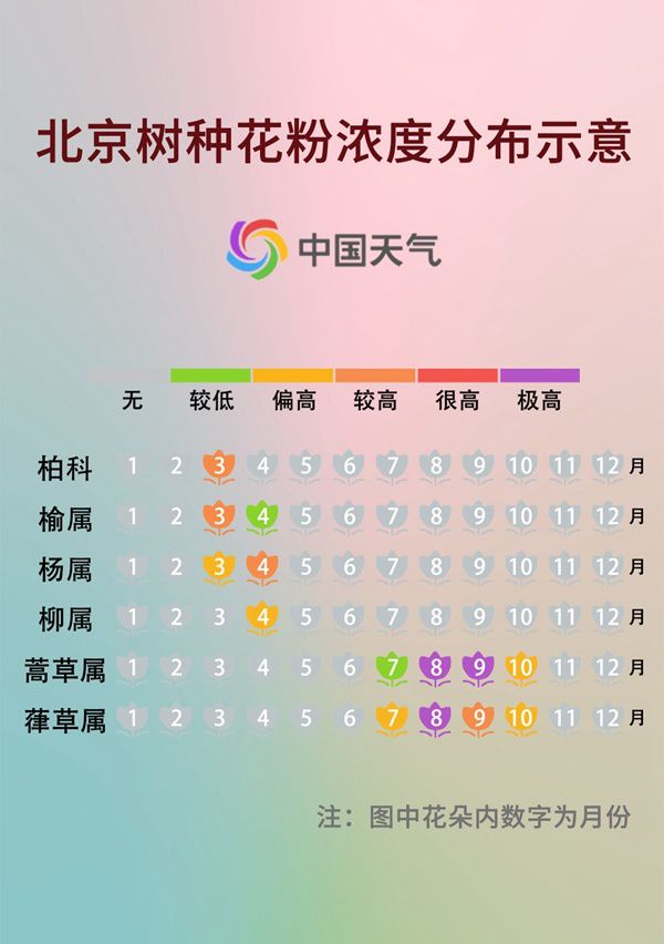花粉过敏多发于春秋两季,春季花粉过敏集中在3月至4月,过敏原以柏科、垂柳等植物的花粉为主。北方部分地区的花粉过敏情况比春季更早到来的南方还要严重,此时节,北方天气晴多雨少,空气干燥且多风,天气条件利于花粉传播。