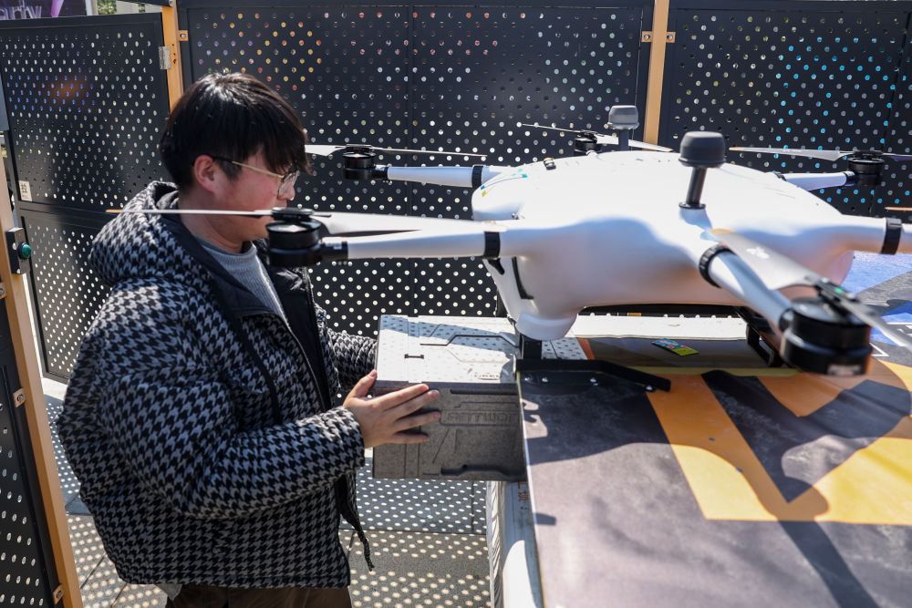 在宁波市江北区,工作人员将外卖配送盒装上无人机,准备进行无人机配送。图源:新华社客户端
