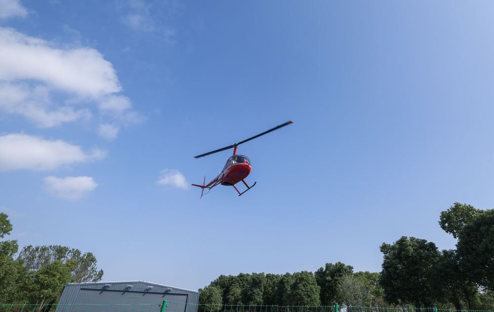 游客乘坐米旗通航直升机飞行基地的直升机在空中饱览太湖南岸美景。图源:新华社客户端