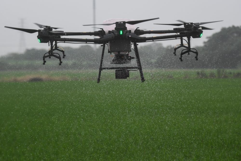 植保无人机在稻田上空进行施肥作业。 图源:新华社客户端