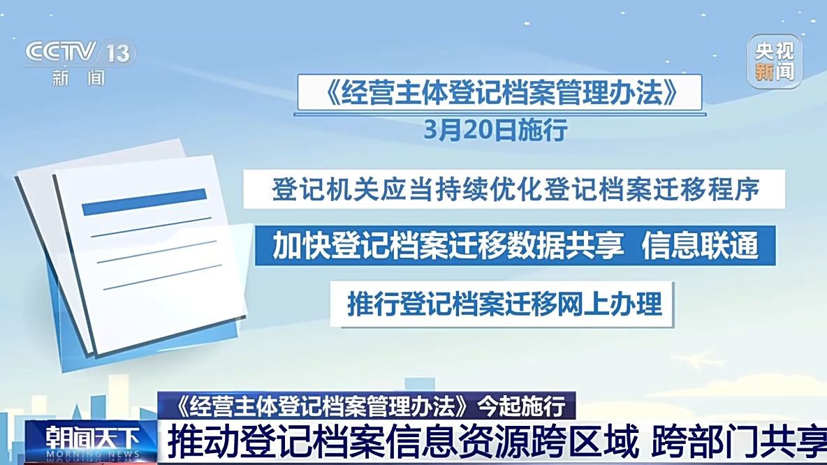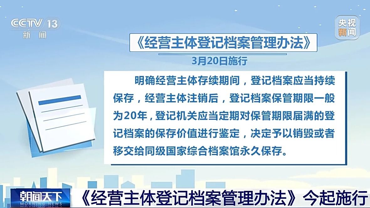 日前,市场监管总局和国家档案局联合制定出台《经营主体登记档案管理办法》,加强经营主体登记档案的规范化管理,有效保护和利用登记档案。《办法》从今天(20日)起正式施行。