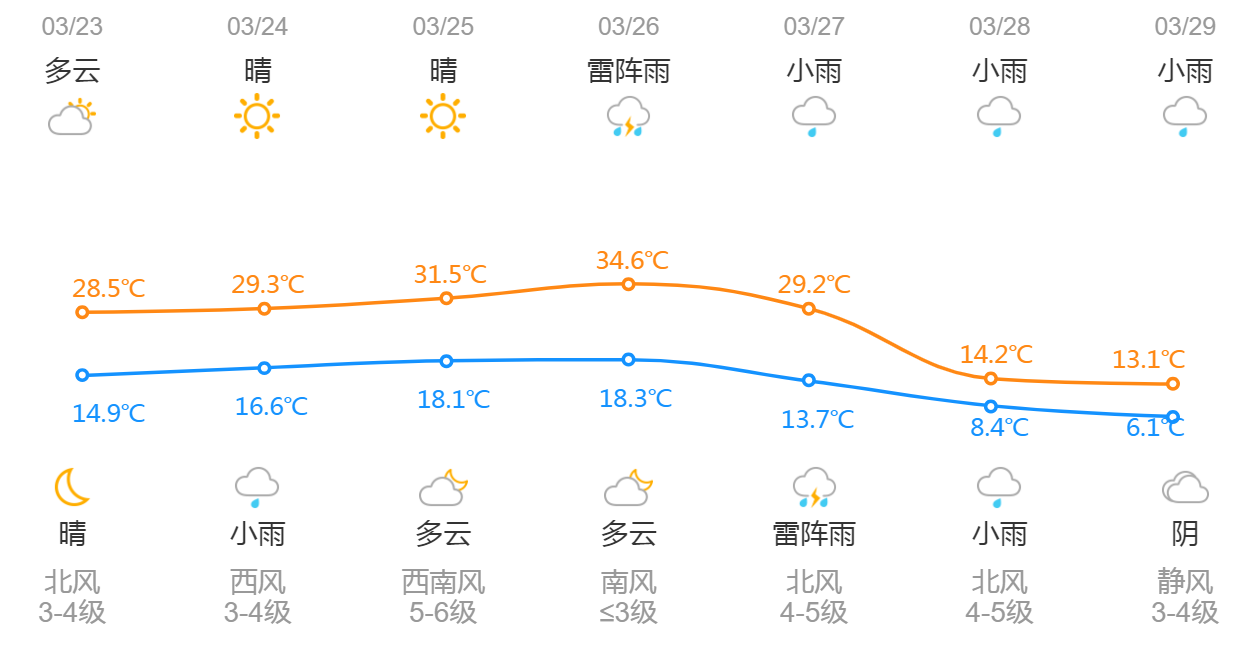 昨天(3月22日),全省大部地区最高气温已经达到25-28℃,杭州临安以28.7℃拿下全省最高,主城区27.1℃较前一天也有近1℃的涨幅。