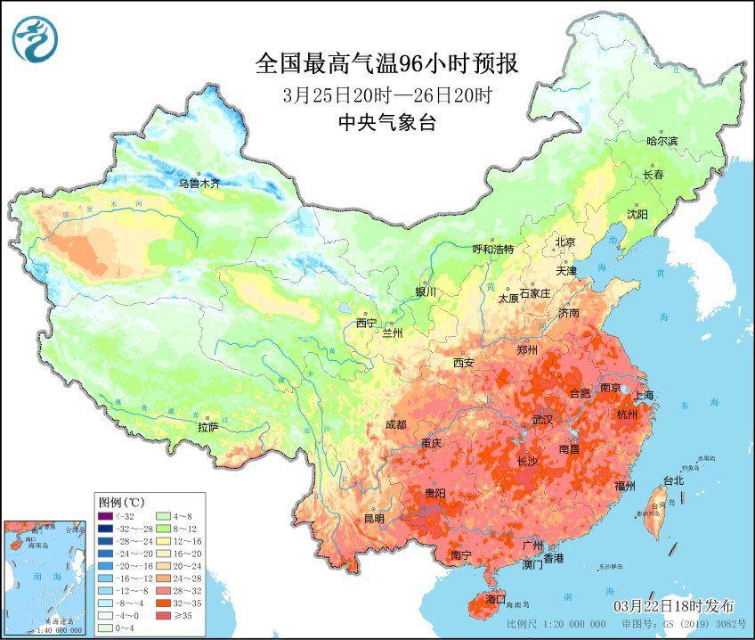 而放眼全国,浙江只是本轮超级大回暖浪潮中的一朵小浪花。预计25-26日,黄河以南地区暖热达到巅峰,最高气温大范围超过30℃,江南华南局地还将出现高温,恍如夏日。