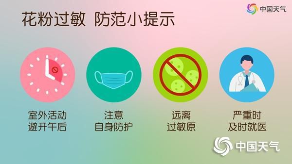 晴朗干燥天气下,全国多地正处于花粉过敏高发时期,建议敏感人群最好避开10时至17时这一花粉浓度较高时段进行户外活动,外出佩戴好口罩,用镜片眼镜代替隐形眼镜,回家后及时清洗口鼻、更换衣物。如果在室内,可以关闭门窗减少空气流动,或使用空气净化器降低室内花粉浓度。