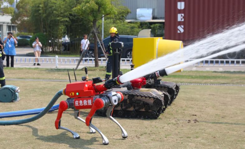 演练场上,智能机器狗被改装成移动水炮,它们小巧灵活,在复杂的火灾现场畅行无阻,轻松抵达消防员难以涉足的狭窄空间。随着智能机器狗精准定位火源,喷射出强有力的水柱,演练现场的火被迅速扑灭。同时,排烟消防机器人也全力作业,快速驱散现场烟雾,无人机与机器人相互配合,利用先进探测技术排查风险,既提升了灭火救援的精准度,又降低了一线作战人员的安全风险。