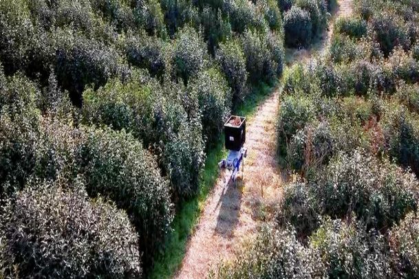 只见机器人银灰色金属骨架上背负着黑色框篓,橡胶足垫伴随交替摆动的四足精准嵌入泥土,发出稳重落地的嗡鸣,它穿过茶道,越过土坡,灵活又平稳地将茶农新鲜采摘的茶叶运送至山下集散点。
