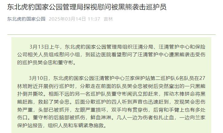 今年3月10日,东北虎豹国家公园6名队员在开展例行巡护时,一名队员被树后突然窜出的一只黑熊扑倒并撕咬,另一名队员在施救过程中后脑部被黑熊抓伤。截至3月11日,两名受伤队员经救治后病情基本稳定。