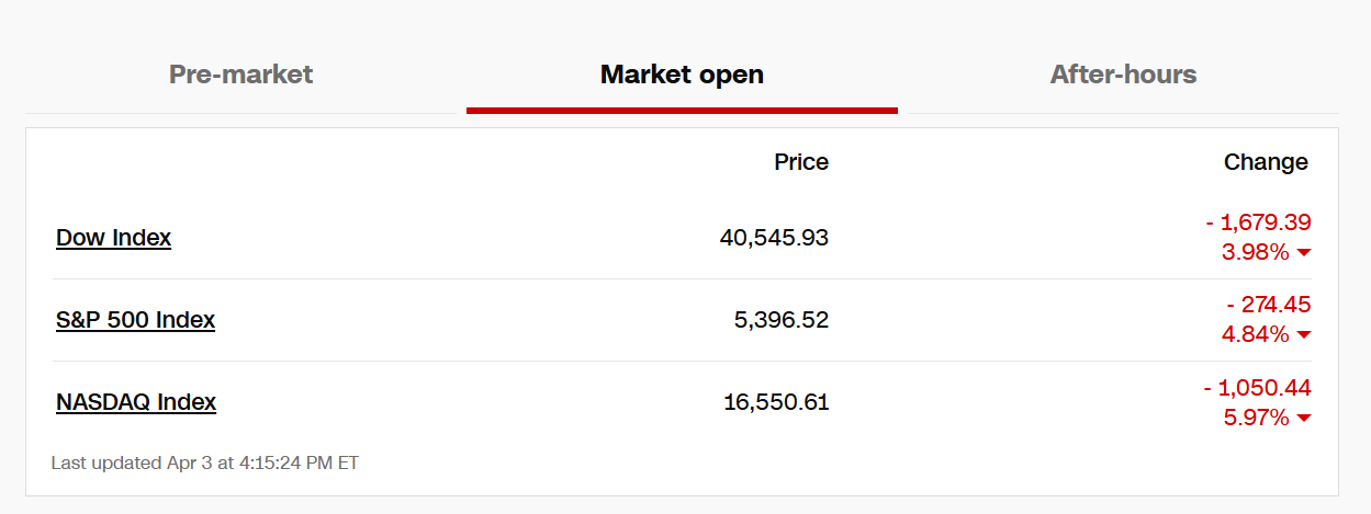 当地时间4月3日,由于美国总统特朗普宣布了全面征收关税的计划,增加了爆发全球贸易战的风险,美国股市当日收盘暴跌。三大股指均刷新近5年来最大单日跌幅纪录。