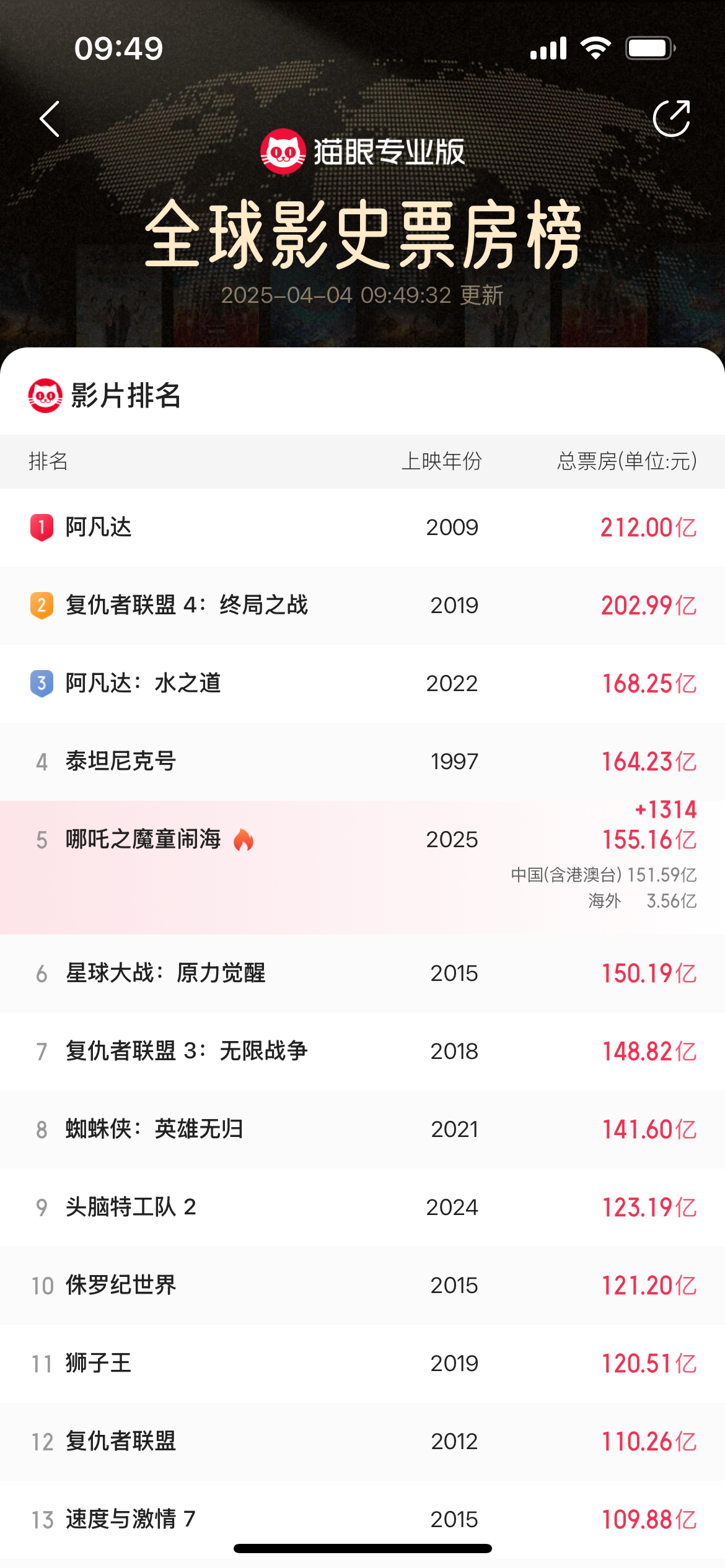 目前《哪吒2》全球票房已超155.16亿,排名全球影史票房榜第5位。