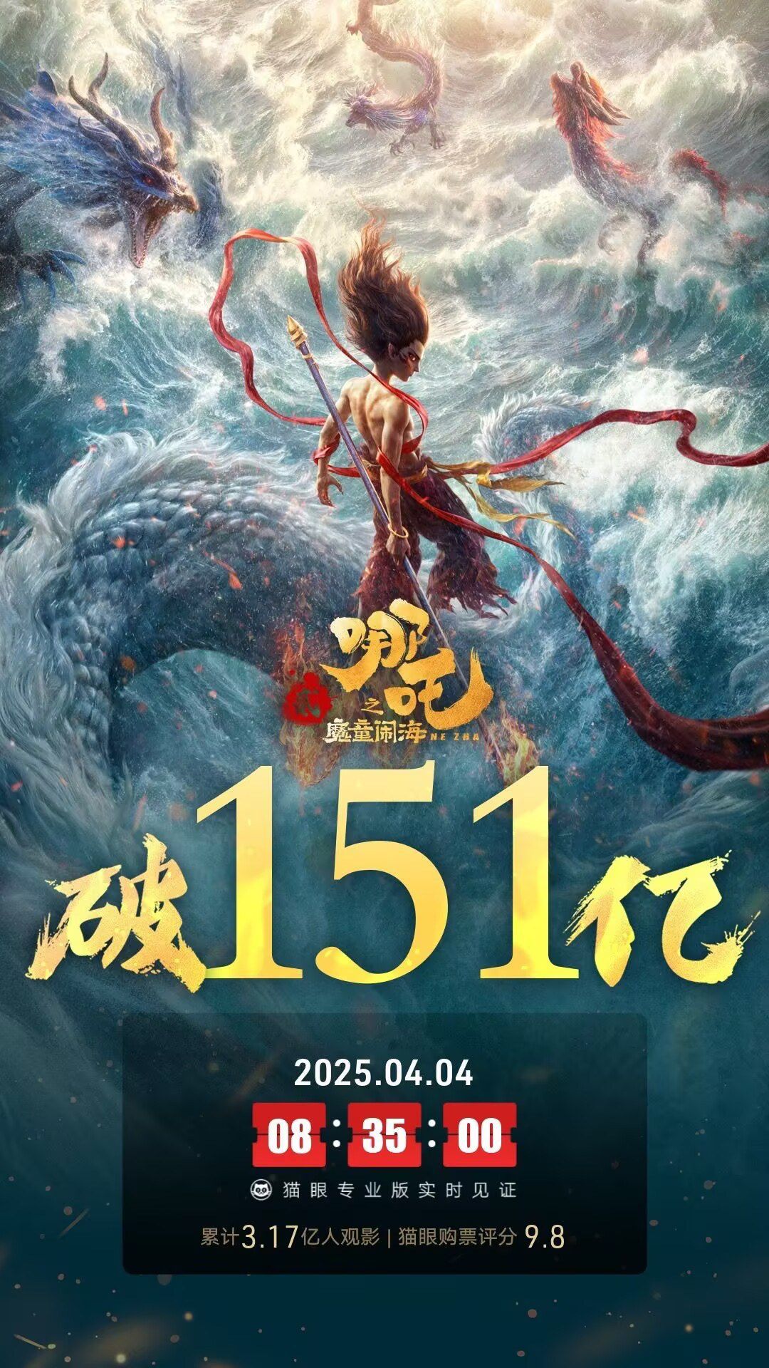 据猫眼专业版数据,截止4月4日8时35分,《哪吒之魔童闹海》(以下简称《哪吒2》)上映66天,国内票房破151亿。经两次密钥延期后,在国内将持续上映至4月30日。