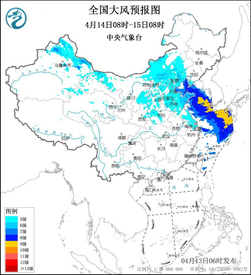 4月14日8时至15日8时,内蒙古中部、华北北部和东部、黄淮东部、江淮东部、东北地区南部以及新疆北疆等地有5~6级大风,阵风7~9级,其中,新疆北疆北部、河北北部、北京西部山区、山东半岛等地局地阵风可达9~10级;渤海、渤海海峡、黄海大部海域、东海大部海域将有7~8级、阵风9~10级的大风,其中黄海中部和南部的偏东海域、东海东北部海域风力可达9级、阵风10~12级。