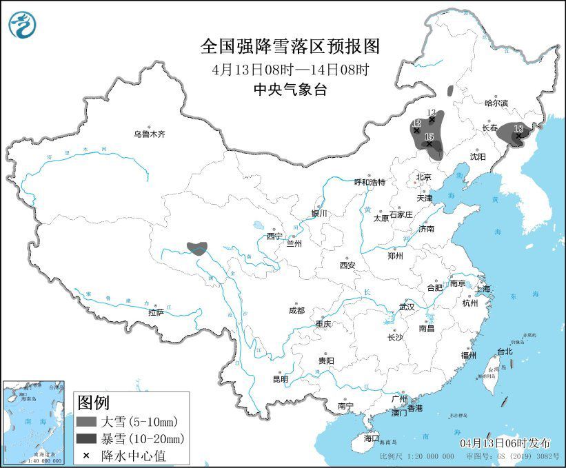 预计4月13日8时至4月14日8时,内蒙古中东部、吉林东部山区、青海南部等地部分地区有大雪,局地有暴雪(10~18毫米);上述地区新增积雪深度3~8厘米,局地可达15厘米左右。