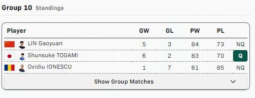 林高远对阵日本选手户上隼辅,首局两人战至14-12,林高远险胜。随后户上隼辅11-9、11-9连扳两局。第四局林高远11-5赢下。在小组赛胜局方面,户上隼辅6胜2负,林高远5胜3负,因此本组户上隼辅作为小组头名,晋级16强。