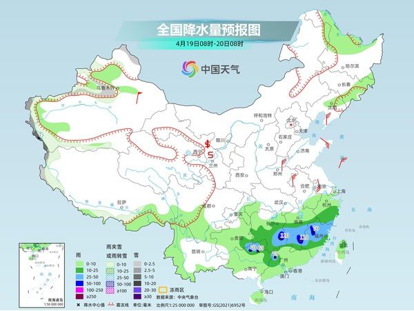 中央气象台预计,今天,新疆北疆高海拔地区及南疆西部山区、西藏南部等地部分地区有小到中雪或雨夹雪,局地大雪。西南地区东南部、江南大部、华南北部等地部分地区有中到大雨,其中,贵州东部、湖南东部、江西中南部、福建中北部、广西北部、广东西北部等地部分地区有暴雨,局地大暴雨。
