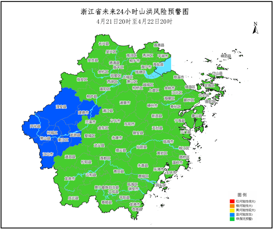 浙江省水利厅、省气象局4月21日17时37分联合发布山洪灾害预警:据省气象台未来降雨预报,预计4月21日20时至4月22日20时,淳安县、建德市、柯城区、衢江区、常山县、开化县、龙游县、江山市可能发生山洪灾害(蓝色预警)。
