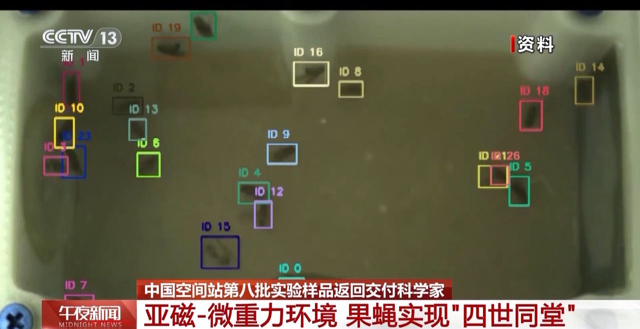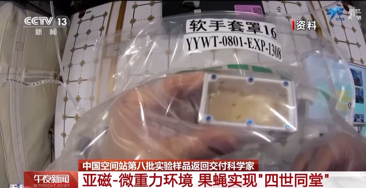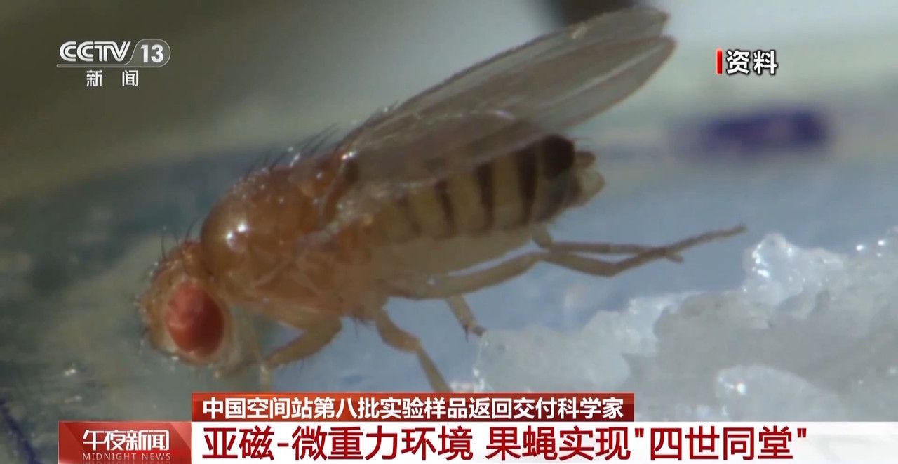 跟随天舟八号货运飞船上太空的这些果蝇,在空间站展开的是亚磁-微重力实验,也就是看果蝇在类似于月球、火星这样几乎没有磁场没有重力的条件下繁育、生长会有何不同?正是在这样的环境里,这些顽强的小飞虫繁育了三代,开个玩笑可以说真的是在中国空间站实现了“四世同堂”。