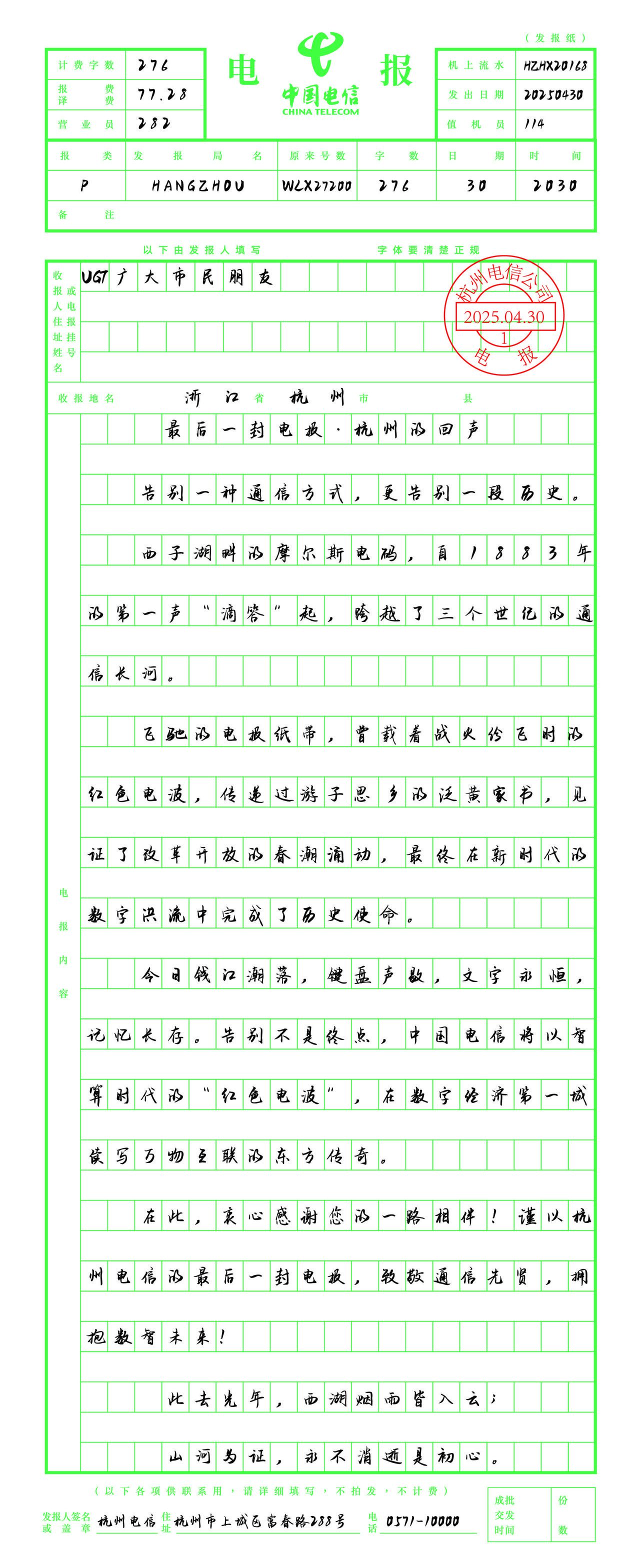 在此,衷心感谢您的一路相伴!谨以杭州电信的最后一封电报,致敬通信先贤,拥抱数智未来!