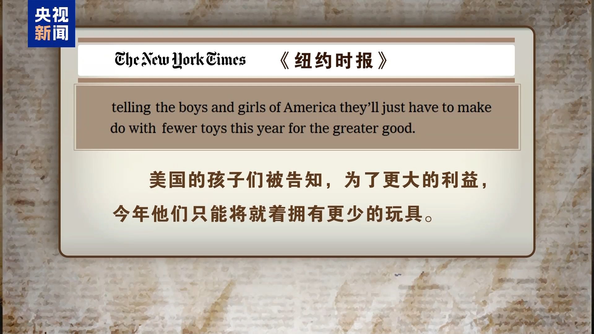 《纽约时报》以讽刺的口吻指出,美国的孩子们被告知,“为了更大的利益”,今年他们只能将就着拥有更少的玩具,这话听上去“令人不快且实诚”。