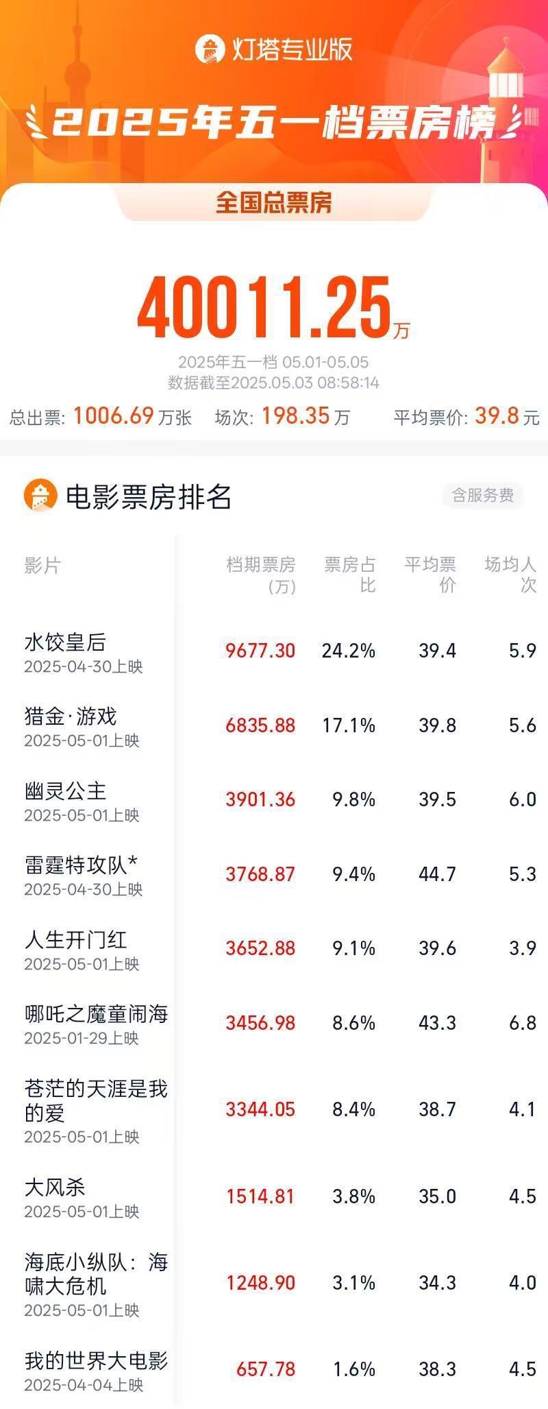 据网络平台,截至5月3日8时58分,2025年五一档(5月1日—5月5日)档期内总票房(含预售)突破4亿,影片《水饺皇后》《猎金·游戏》《幽灵公主》暂列前三名。