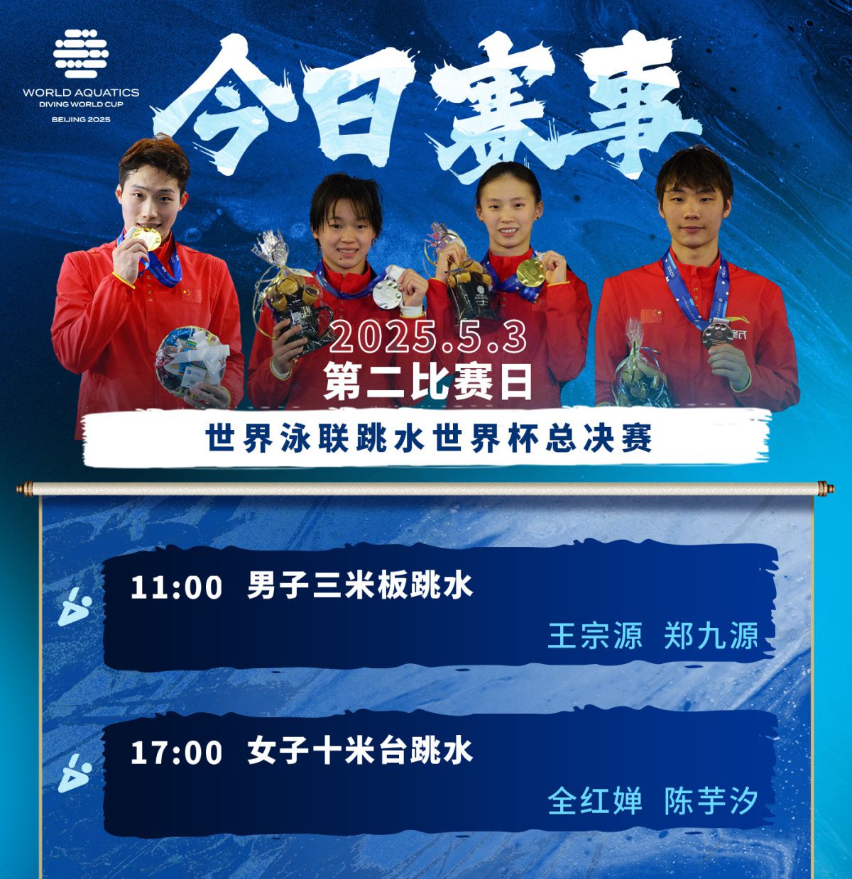 5月3日,2025跳水世界杯总决赛进入第二日,将诞生2枚单人金牌。新赛制下,王宗源、郑九源迎挑战,全红婵和陈芋汐上演巅峰对决。