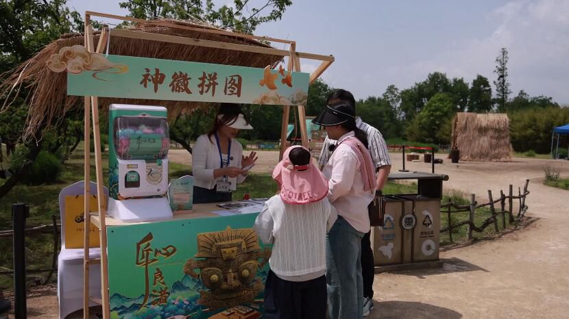 良渚古城遗址公园以良渚文化核心符号“神人兽面纹”为轴心,推出集互动游戏、艺术展览与手工体验于一体的文化盛宴,让游客们在趣味实践中触摸五千年良渚文明的精神密码。在雉山驿站区域,“良渚神徽”主题创作展吸引不少游客驻足欣赏,“文明溯源”“薪火相传”“神秘探索”“艺术创意”四个板块共72组作品,生动演绎良渚文化的神徽图腾、玉器纹饰及先民生活图景。良渚神徽版画拓印、DIY神徽图案陶艺作品等良匠工坊手工体验活动也将相继开展,带领大家与非遗传承人合作,了解良渚文化的深厚内涵和独特魅力。