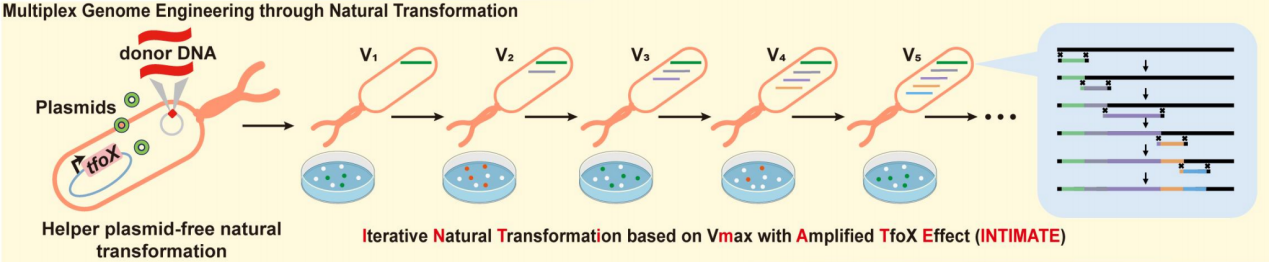 近年来,合成生物学技术飞速发展为降解菌株的构建提供了可能。研究团队通过研究,精准锁定了具有最快繁殖速率、高盐耐受和易基因编辑等特性的耐盐菌株“需钠弧菌(Vmax)”,并通过调控基因精准构建可调控的具有高效自然转化能力的菌株VCOD-2。这一菌株相较于自然界中微生物,转化效率可提升数倍。