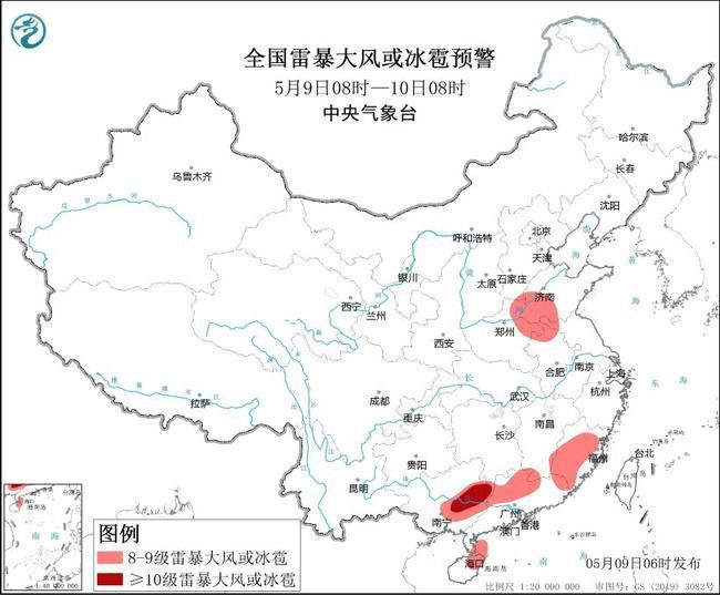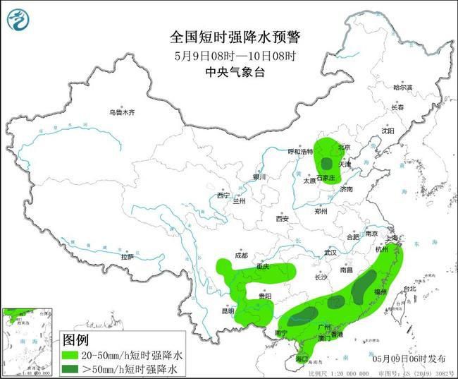 预计5月9日8时至10日8时,黄淮中部、江南东部、华南等地的部分地区将有8级以上雷暴大风或冰雹天气,其中,广西东部等地的部分地区将有10级以上雷暴大风,最大风力可达11级以上;华北中部、江南东部、西南地区东部、华南等地的部分地区将有小时雨量大于20毫米的短时强降水天气,其中,河北西南部、江西南部、福建西部、广西东部、广东北部等地的部分地区小时雨量大于50毫米,最大可达80毫米以上。