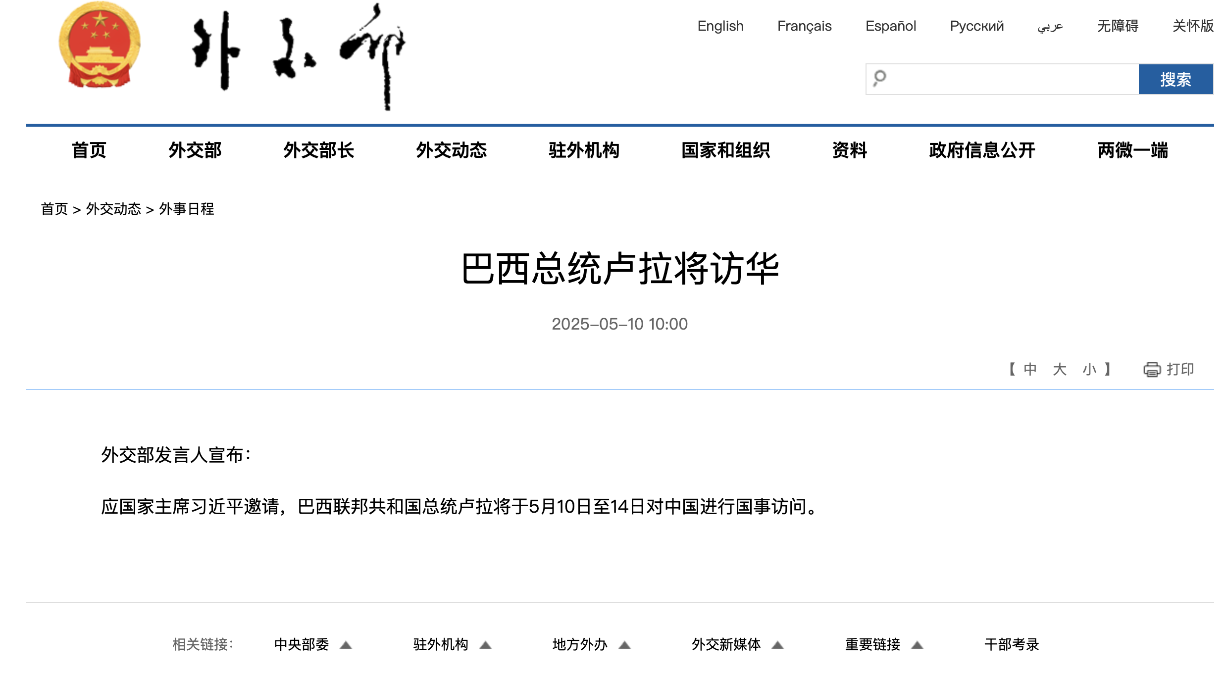 外交部发言人10日宣布:应国家主席习近平邀请,巴西联邦共和国总统卢拉将于5月10日至14日对中国进行国事访问。