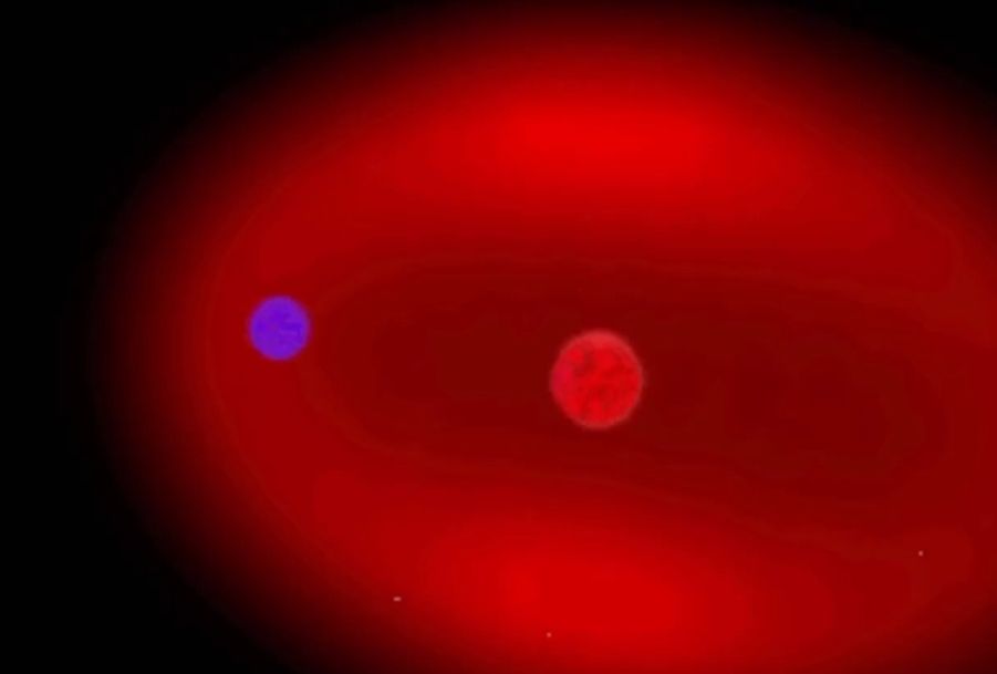 △共包层演化模拟,蓝色天体为中子星,红色天体为膨胀的巨星。