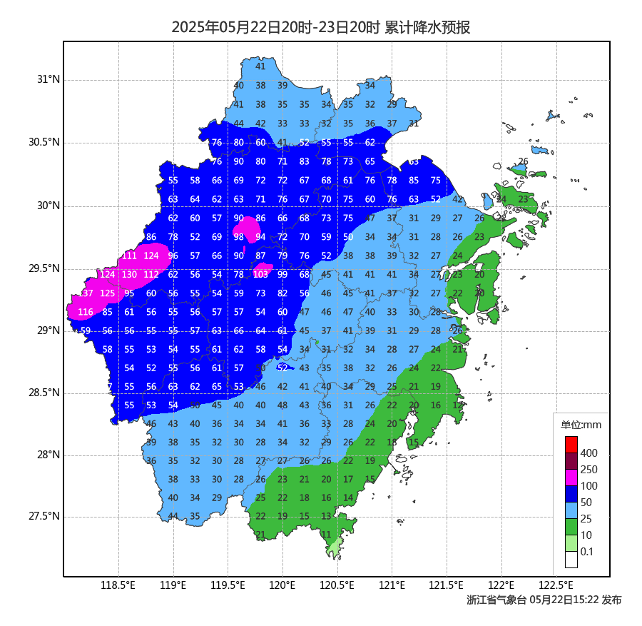 今天白天,暴雨持续。据省气象台预报,这次降水过程(22日8时至24日8时),累计雨量全省大部30~60毫米,杭州、衢州、丽水、金华、绍兴、宁波等地部分70~100毫米,局部150~200毫米,最大小时雨强50~70毫米。夜里,浙南和沿海的局地还会有大到暴雨,其它地区的雨势转小。