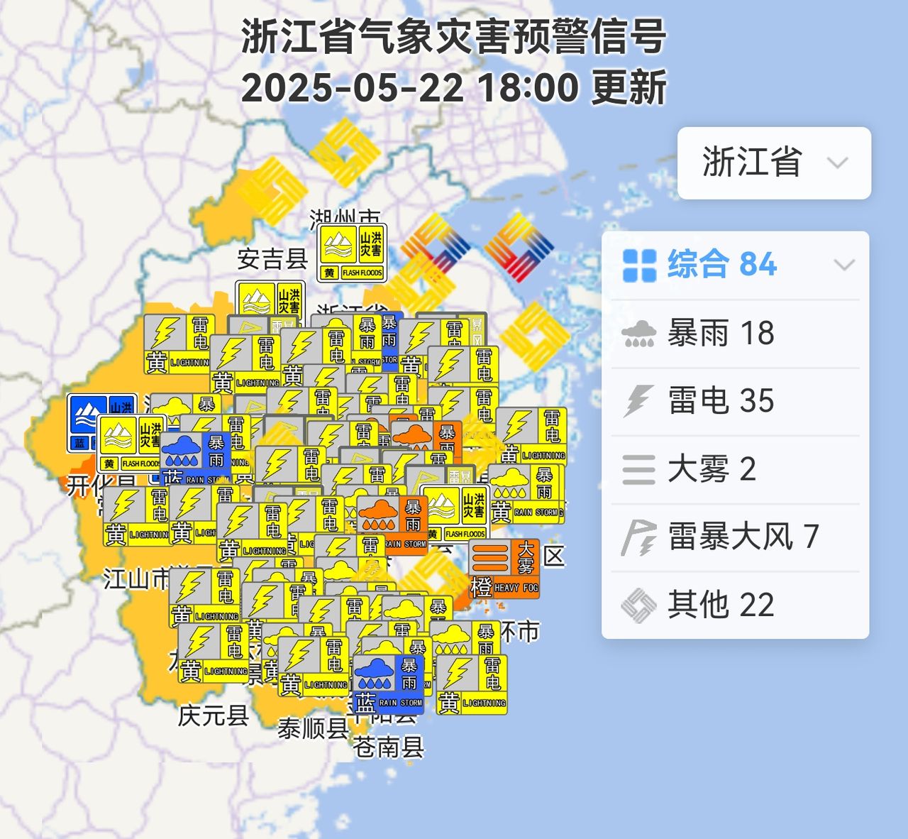 昨天午后起,浙西和浙南部分地区率先起雨,3小时(13时-16时)累计降水量共有10个站超过50.0毫米,小时雨强最大出现在衢州市衢江区的黄泥岭村站,为65.6毫米。后半夜起,范围扩大,浙中北地区及丽水有大到暴雨,杭州、衢州、金华、丽水北部、绍兴西部等地局部大暴雨,有雷雨地区局地可伴有8~10级雷雨大风。