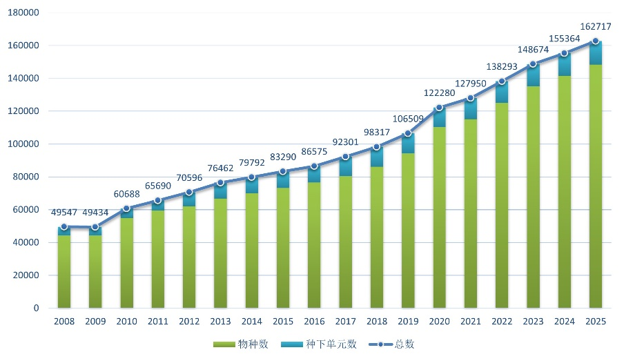 2025版名录共收录物种及种下单元162717个,其中物种148341个,种下单元14376个。较2024版新增6857个物种和496个种下单元,动物界新增4994个物种和470个种下单元,植物界新增458个物种,减少5个种下单元,真菌界新增1405个物种和31个种下单元。
