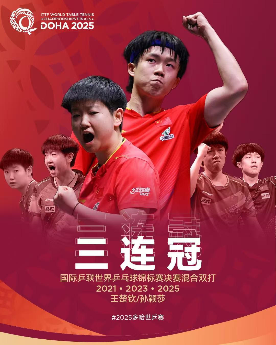当地时间5月24日,2025年多哈世乒赛进入倒数第二个比赛日争夺。在刚刚结束的混双决赛中,中国队组合王楚钦/孙颖莎以3:1战胜日本队组合吉村真晴/大藤沙月,连续第三次夺得世乒赛混双冠军。