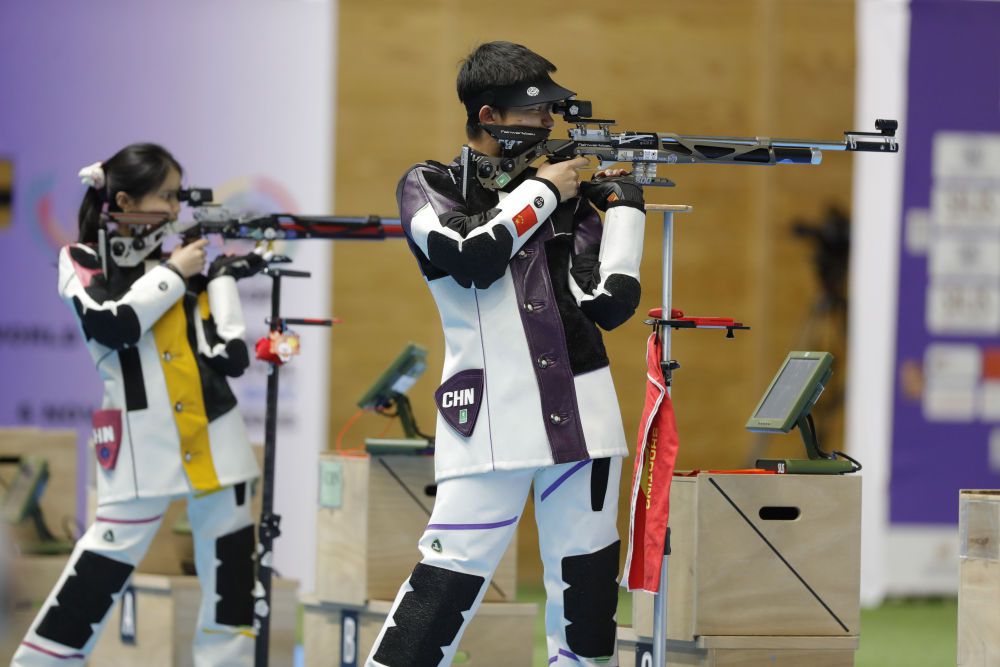 在9日进行的射击世锦赛比赛中,中国队王子菲/盛李豪和彭鑫露/王竑昊在10米气步枪混合团体项目中包揽金、银牌。