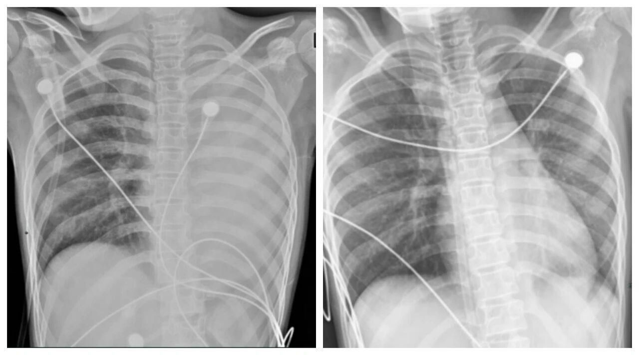 △笑笑治疗前,左肺呈“白肺”状态,治疗后“白肺”被吸收,心脏边缘清晰可见。图源:浙大四院