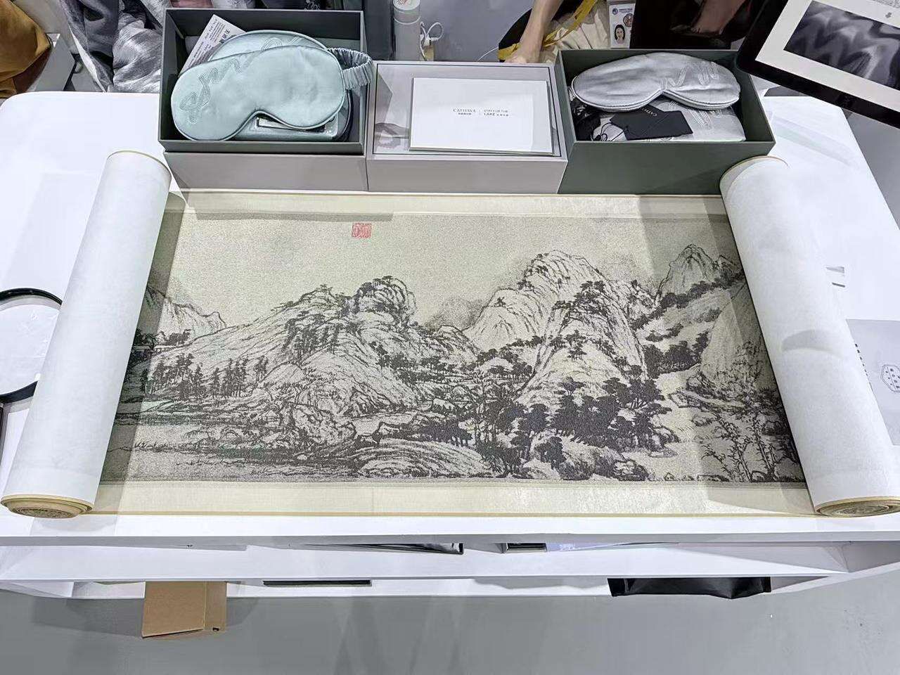 同样,在传统领域开辟技术新赛道的还有凯喜雅丝绸。“这幅9米长的《富春山居图》真丝织品,没有任何染色和印花,全靠黑色纱线织成,还能呈现出丰富的明暗层次。”工作人员朱妙的介绍和现场展示引来不少人围观。这款首发首展首秀的展品背后,是凯喜雅独有的蝴蝶缎超精细织造技术,其精度较传统工艺提升20倍,每平方米5500万的织点密度,让2亿个织点共同复刻出传世名画的神韵,AI算法让传统织造实现了更多可能。