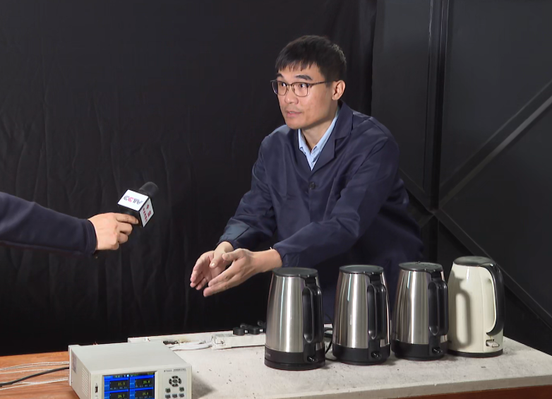 消防员用一组模拟试验带你直观感受它的危险。模拟试验中,消防员用4个1800瓦的烧水壶插在2500瓦的插线板上,并把插线板电线捆扎在一起,四个水壶同时工作,用测温仪实时监测插线板电线的温度。