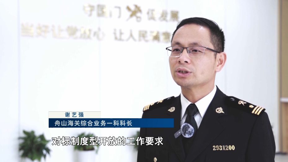 舟山海关综合业务一科科长 谢艺强:对标制度型开放的工作要求,全力攻坚改革创新,助力舟山打造具有鲜明辨识度和影响力的全球大宗商品资源配置枢纽。