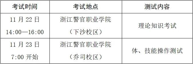 考生须持本人身份证于11月22日8:00—11:00到浙江警官职业学院(下沙校区)办理报到手续,根据考点规定填写各类表格、领取准考证,并了解考试相关安排。