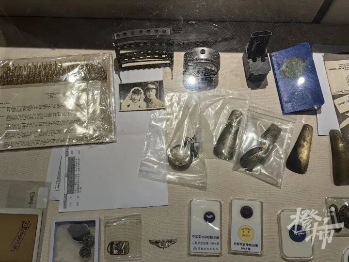 展柜里,他用过的飞行眼镜、空战中坠落的日军飞机残骸、中央航校校旗等文物静静陈列……