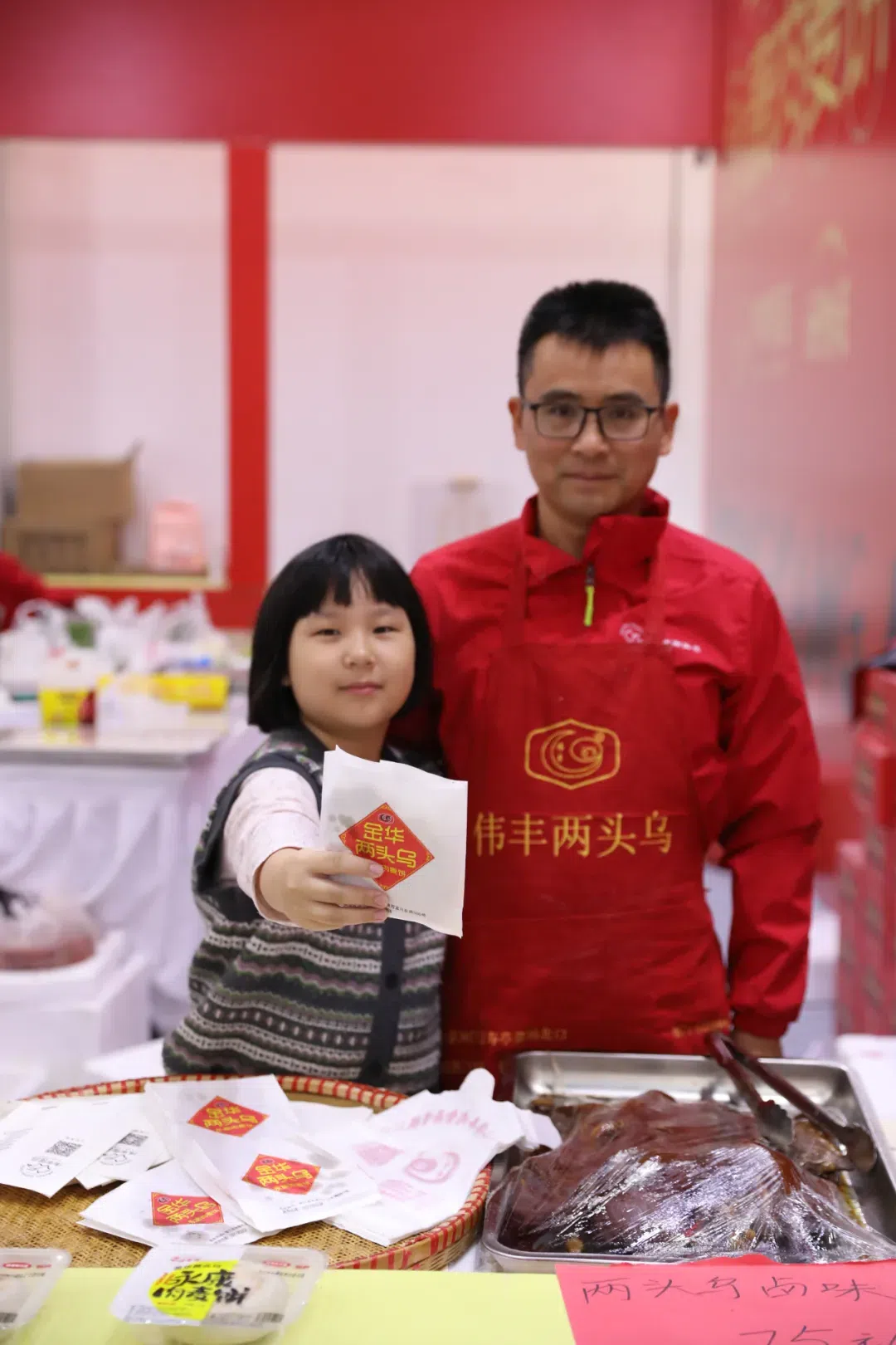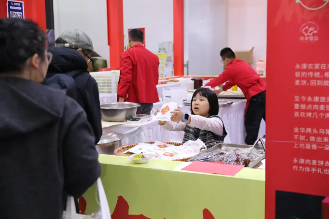 10岁的女孩坐在展位前的椅子上,像唱着童谣似的,为爸妈吆喝着生意——“永康肉麦饼,永康肉麦饼,十块钱一个,非常非常好吃,大家快来吃哟!”