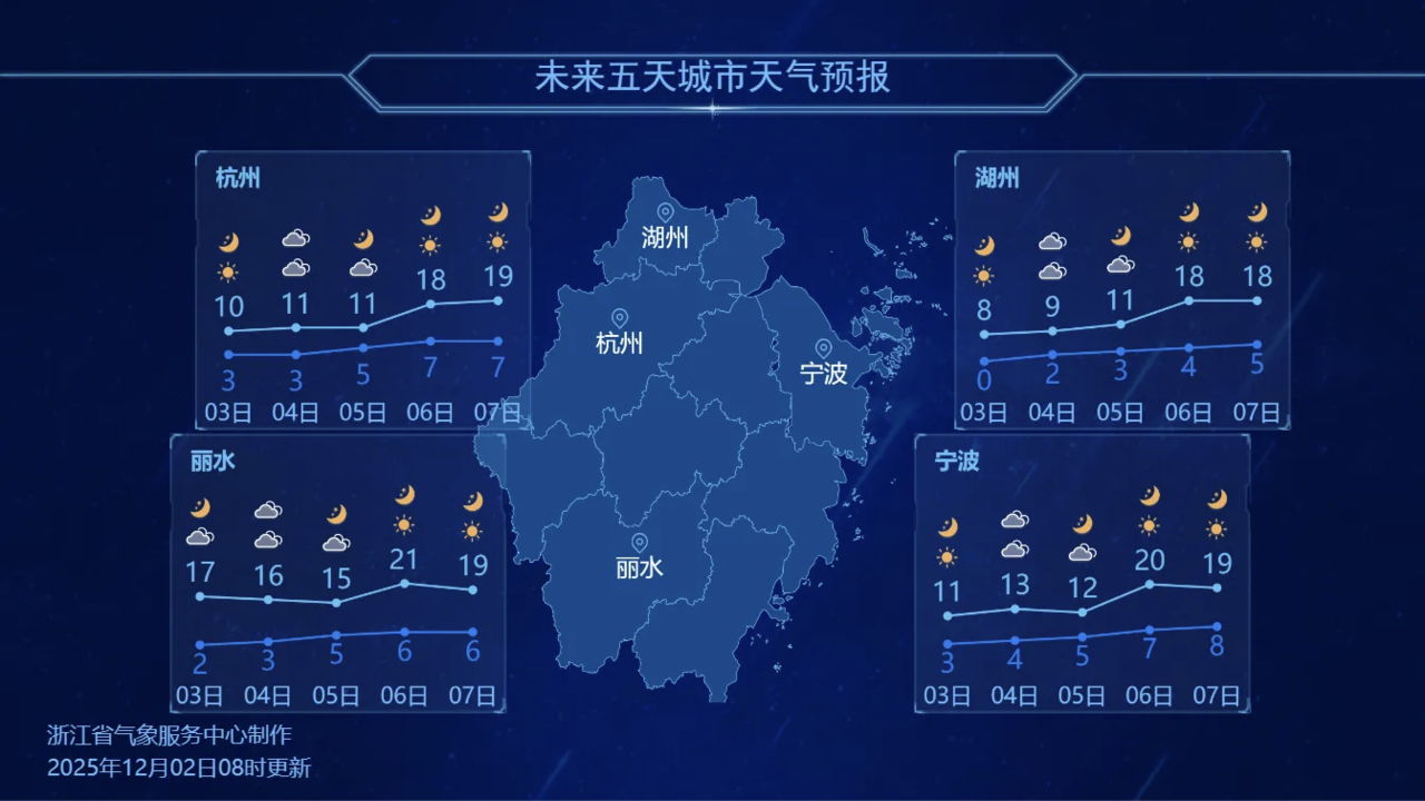 这股冷空气来得短暂,走得也干脆。像是杭州,从5日起气温重新走上回暖之路,6日之后最高气温升到18℃左右。到了周末,全省最高气温都会回升到20℃左右,切换回晴暖频道。