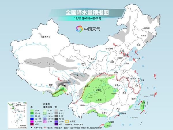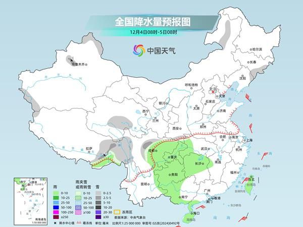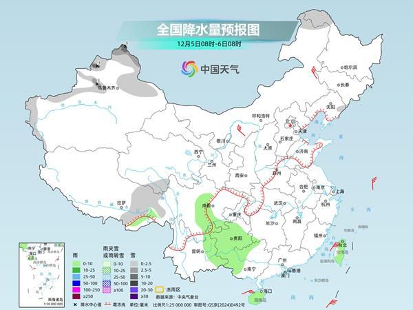 具体来看,中央气象台预计,今天,内蒙古东部、黑龙江东北部、吉林东部、辽东半岛、山东半岛北部、新疆南疆南部、西藏北部和东部、青海中部和东南部、甘肃南部、陕西南部、川西高原等地部分地区有小到中雪或雨夹雪,其中,西藏东部局地有大雪;西藏东南部、西南地区东部、湖北西部、湖南中北部、广西南部、海南岛、台湾岛等地部分地区有小到中雨。